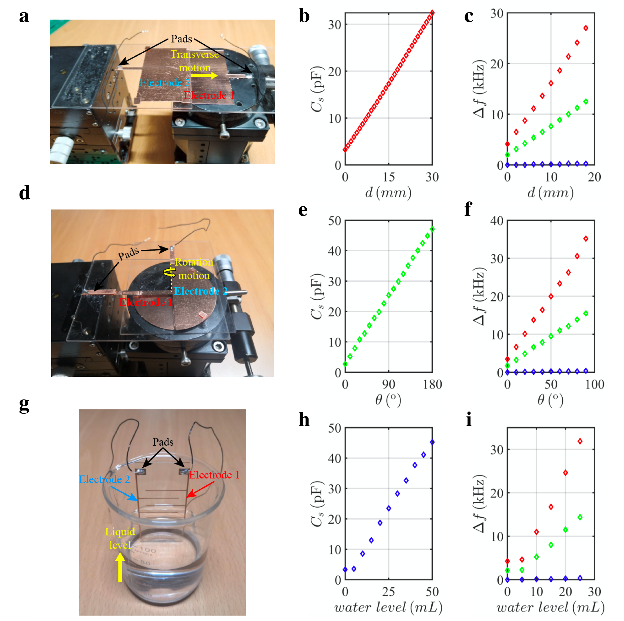 为了检验制备的非厄米拓扑传感电路效能,研究人员又制备了依赖于位移、旋转角度和液位三种物理量电容器,如图3a、3d和3g所示,目的是真实感知位移、旋转角度和液位三个物理量。位移和转角电容器采用平行电极板构型,其中电容大小与位移和转角呈线性关系,如图3b和3e所示。液位电容器则采用平面叉指电极构型。当液面接触到电极后,液位的提升引起电容线性增加,如图3h所示。通过将电容器连接到拓扑电路的首尾两端,物理量的微小变化可以通过观察阻抗频率的移动来识别。图3c、3f和3i分别展示了位移、转角和液位三种物理量变化引起的频移,其中红色和绿色菱形分别对应于N=19和N=11非厄米拓扑电路的结果,蓝色菱形对应N=19的厄米SSH拓扑电路。可以看出N=19的非厄米拓扑电路敏感性,远大于N=11的非厄米拓扑电路和N=19的厄米拓扑电路。具体的灵敏度之比约为108:50:1。这些结果清楚地证明了非厄米拓扑电路传感器在实现不同物理量的超灵敏识别方面的有效性。