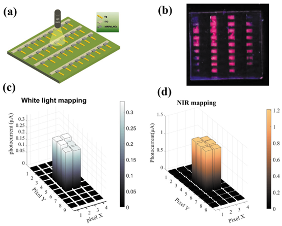 图1 (a)基于CH3NH3PbI3的自供电光电探测器的成像器件结构示意图;(b)成像器件在365 nm紫外光照射下的成像图片;(c)成像器件在白光照射下的光电流位置图;(d) 成像器件在近红外光照射下的光电流位置图