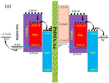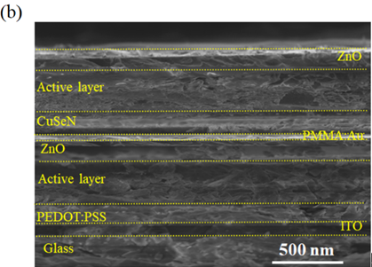 图2 (a)含PMMA:Au夹层的叠层光电探测器能带图及其载流子传输示意图;(b) 该光电探测器的横截面SEM图