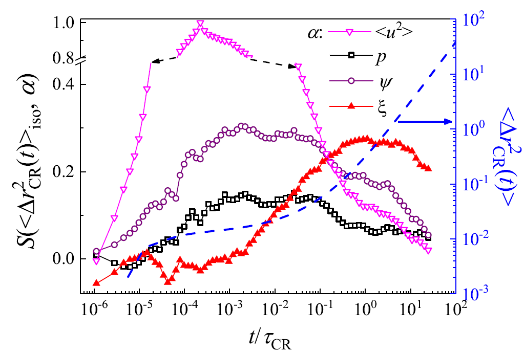 图3 不同的静态量包括Debye-Waller因子<u2>,其简谐近似下的均方位移ψ,低频振动模的参与分数p,以及塑性长度ξ与动态量<<∆r2CR(t)>>的Spearman等级相关系数S。