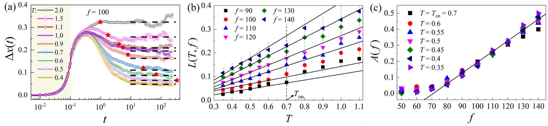 图1 (a) 对粒子施加一外力,其大小f = 100时 (阴影区时间间隔内),粒子平均位移随时间的变化,黑色虚线表示较长时间下平均位移趋近一平台值,即不可逆位移L(T, f)。(b) 不同外力大小时,不可逆位移L(T, f)随温度的依赖规律。