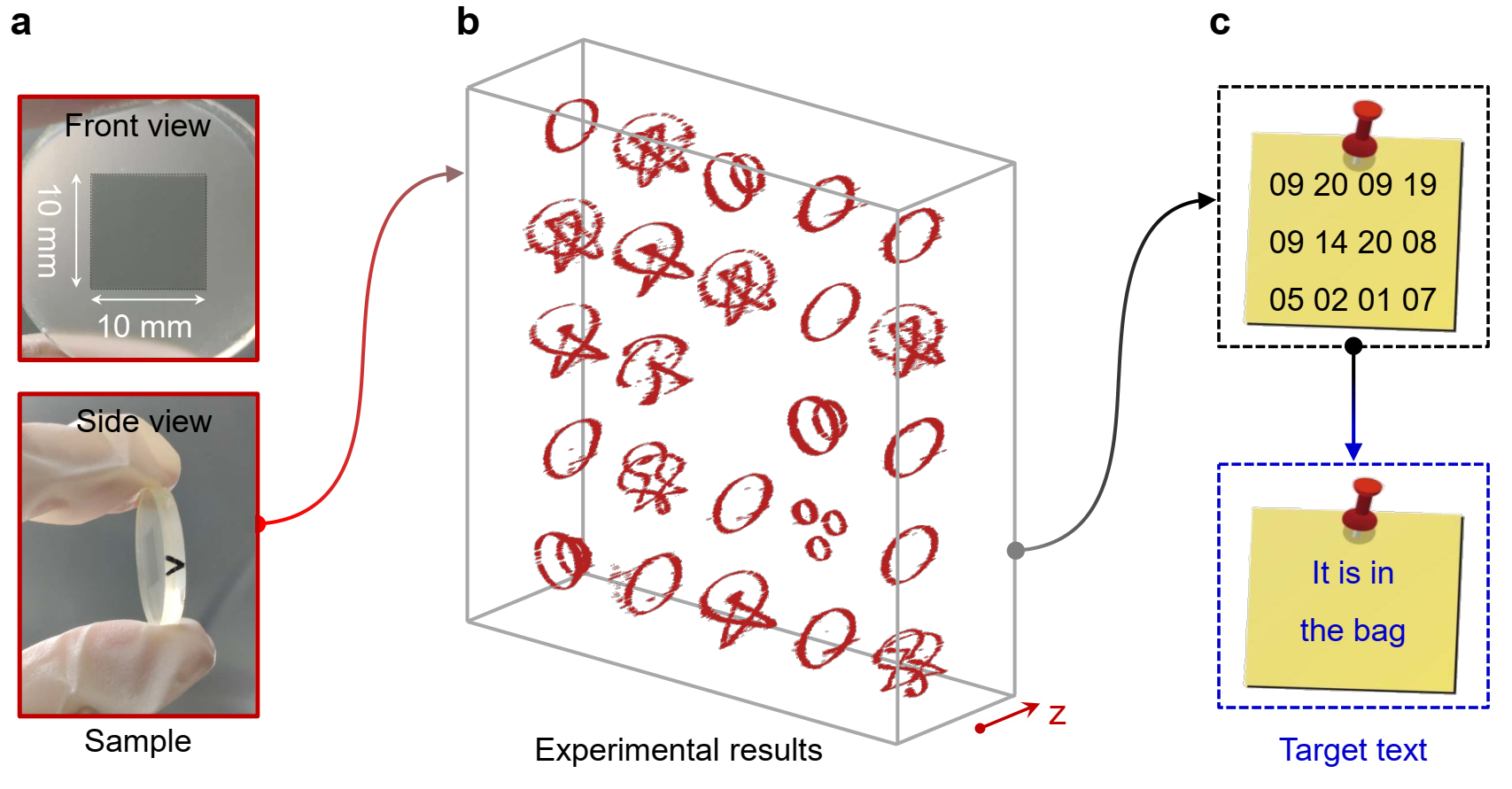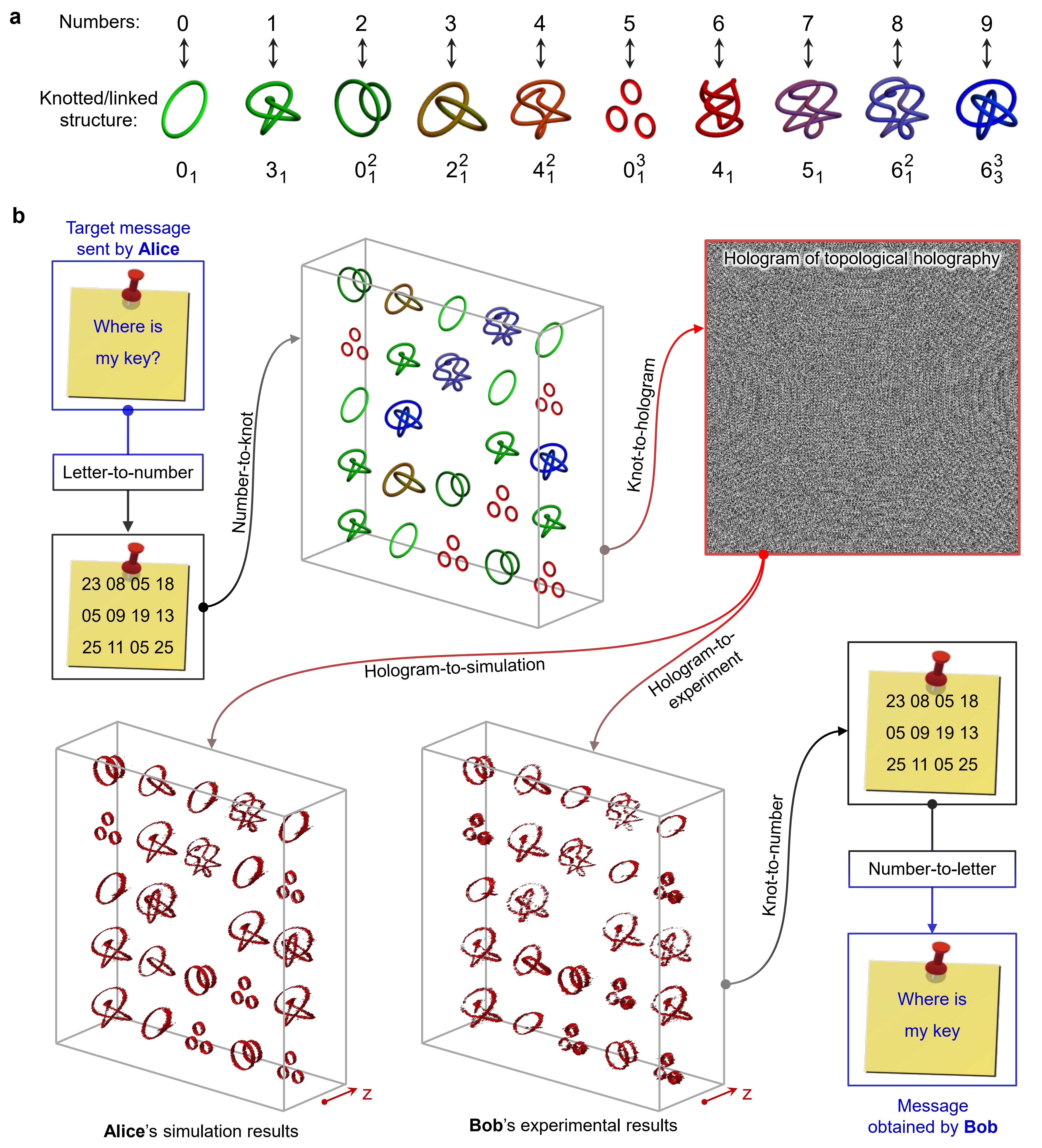 为了证明拓扑全息编码方案的可行性,研究人员选择了十种纽结结构来编码0到9这十个数字,如图3a所示。然后,使用从01到26等两位数字分别表示从A到Z的字母。为了更加具体地描述编码方案,图3b展示了一个实例。这里,目标信息是“Where is my key”。先将字母信息转换为数字组合“23 08 05 18 05 09 19 13 25 11 05 25;”再根据图3a将数字组合转换为纽结结构的组合。基于图1a所示过程,Alice(信息发送者)构建拓扑全息图,用于制备相应的纽结结构阵列。然后,Alice将全息图发送给信息的接收者Bob。Bob通过拓扑全息重构出实验结果,获得每个拓扑结构的拓扑不变量,识别拓扑纽结结构的类型,并将其转换为字母;最后,Bob获得Alice想要发送的消息“Where is my key。”