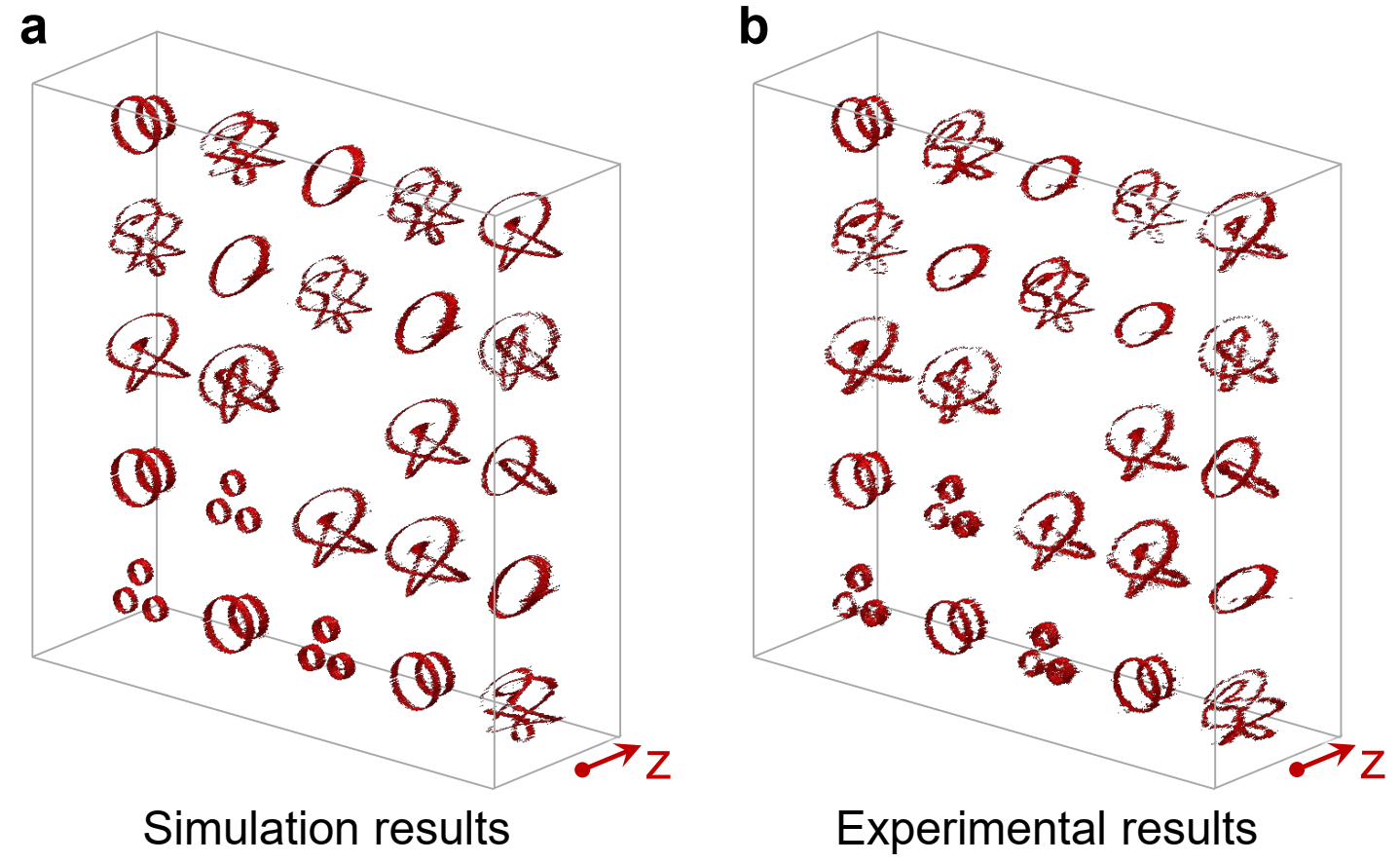 图2. 基于多种纽结结构的拓扑全息。(a)为理论结果,(b)为实验结果。