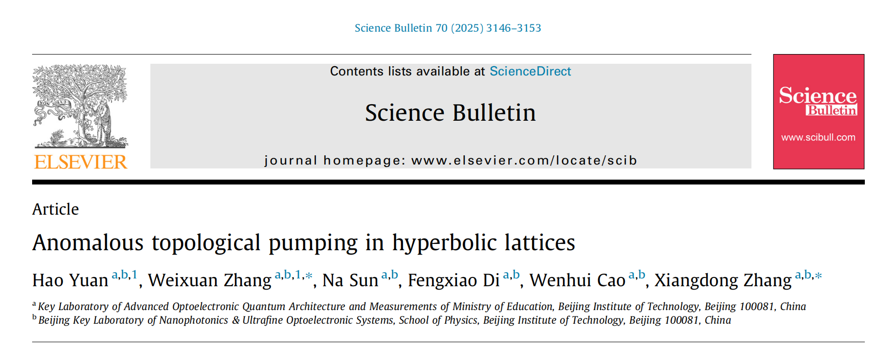 日前,太阳集团城娱8722张向东教授课题组在拓扑电路和双曲晶格拓扑泵浦研究领域取得突破性进展。研究团队首次理论提出并证明了双曲晶格中拓扑泵浦的新机制,设计并制备时变拓扑电路,在实验上观测到兼具高维量子霍尔效应特性与周期边界条件(PBC)依赖的双曲拓扑泵浦现象。相关成果发表于Science Bulletin(Sci. Bull. 70 (2025) 3146–3153),研究工作获国家重点研发计划和国家自然科学基金资助。太阳集团城娱8722袁昊博士(2020级)和张蔚暄教授为论文共同第一作者,张向东教授和张蔚暄教授为通讯作者。