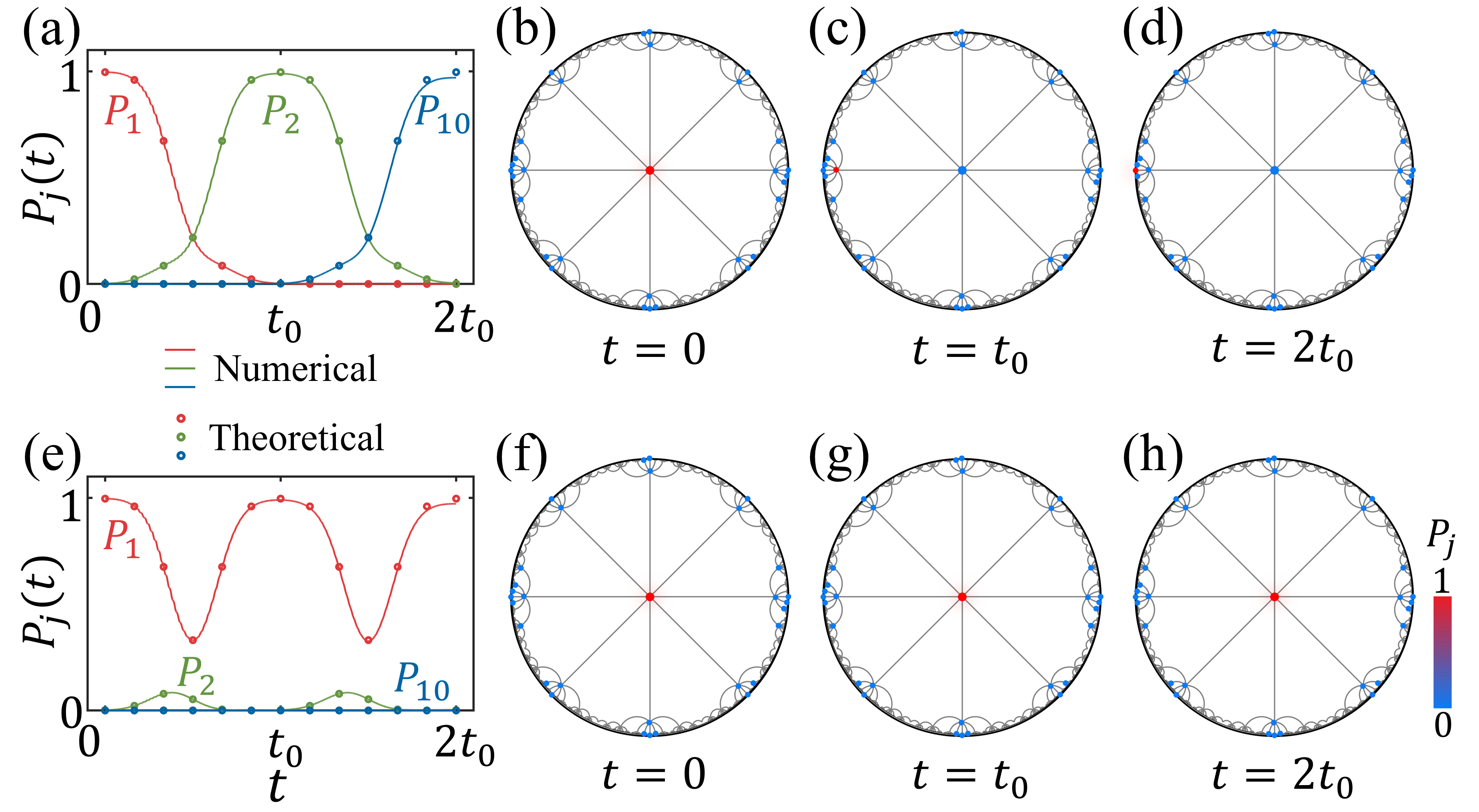 进一步通过计算并对比不同PBC下的格点电压演化,分别观测到跨越原胞的泵浦输运(图4a-d)和拓扑振荡现象(图4e-h)。这些结果严格验证了高维量子霍尔响应在双曲晶格的存在性,并揭示非欧几何通过PBC设计调控拓扑动力学的独特能力。