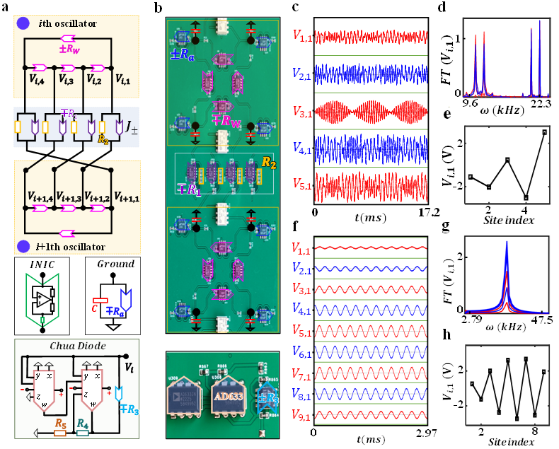 为了对上述理论预言进行实验证明,研究人员设计并制备了两种非厄米-非线性拓扑电路(图3a-3b和图4a-4b所示),使其电压动力学演化方程与图1a和2a中的耦合非线性振子模型的时域薛定谔方程在数学形式上完全一致。进而通过对电路电压演化特性的测量,实现了对上述非厄米趋肤全局同步(图3c-3h)以及非厄米拓扑全局同步(图4c-3h)的实验观测。
