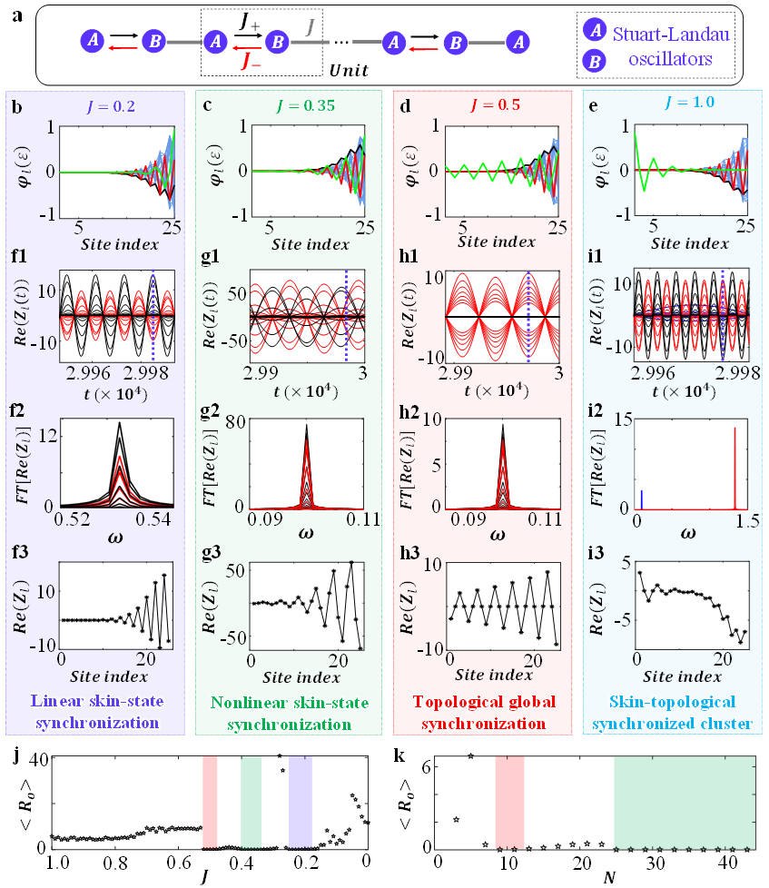 除了非厄米趋肤全局同步效应,研究人员进一步对基于1D非厄米SSH链的耦合非线性振子模型(图2a)进行了研究。研究发现,通过调节拓扑边界态的空间分布和局域强度,可以使系统展现多种非厄米同步效应。当拓扑边界态与非厄米趋肤态局域在同一边界时,系统可以展现非厄米-线性趋肤全局同步(图2b,2f所示,同步趋肤态的局域化程度(IPR)比拓扑态更小),非厄米-非线性趋肤全局同步(图2c,2g,拓扑态和趋肤态的IPR接近)和非厄米拓扑全局同步(图2d,2h,拓扑态的IPR最小)。另外,当拓扑边界态与非厄米趋肤态局域在相反边界时,系统两边界附近的非线性振子分别展现由线性趋肤态和拓扑态主导的同步效应,即非厄米趋肤-拓扑同步簇(图2e,2i)。最后,研究人员进一步计算了序参量随包间耦合强度以及晶格长度的变化关系,揭示了上述非厄米全局同步效应间的转变规律,如图2j和2k所示。