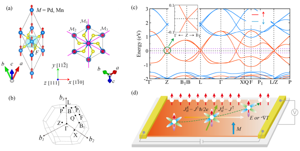 图1:(a-c) 自旋零带隙节线半金属MF3 (M = Pd, Mn)的晶体结构、布里渊区与自旋极化能带结构;(d) 自旋零带隙节线半金属中由反常/自旋霍尔效应、反常/自旋能斯特效应引起的完全自旋极化的横向电荷/自旋流示意图。