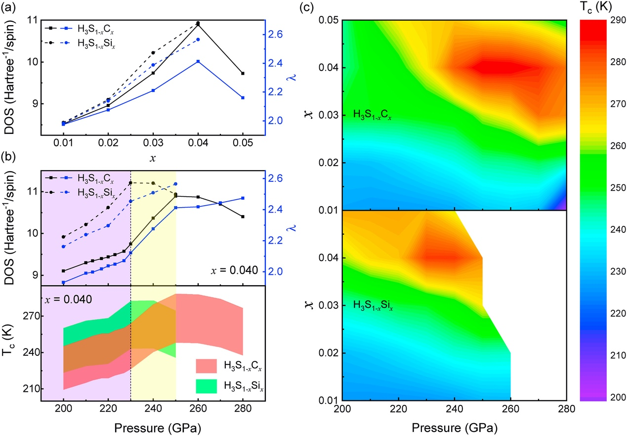 图 2 (a) H3S1-xZx @250GPa (Z="C," Si)的DOS和电声耦合常数。(b) H3S0.960Z0.040的DOS、电声耦合常数和超导相变温度。(c)超导相变温度分布图。
