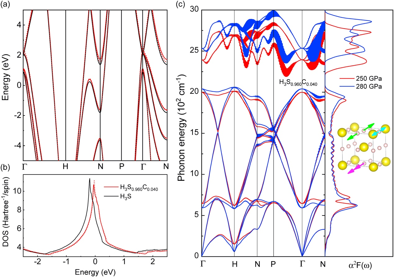 图 1 (a)(b) Im-3m相H3S的能带结构和DOS:H3S@220GPa (黑线),H3S0.960C0.040@220GPa (红色实线),H3S0.960C0.040@240GPa (红色虚线)。(c)声子色散谱和Eliashberg谱函数:H3S0.960C0.040@250GPa (红线),H3S0.960C0.040@280GPa (蓝线)。