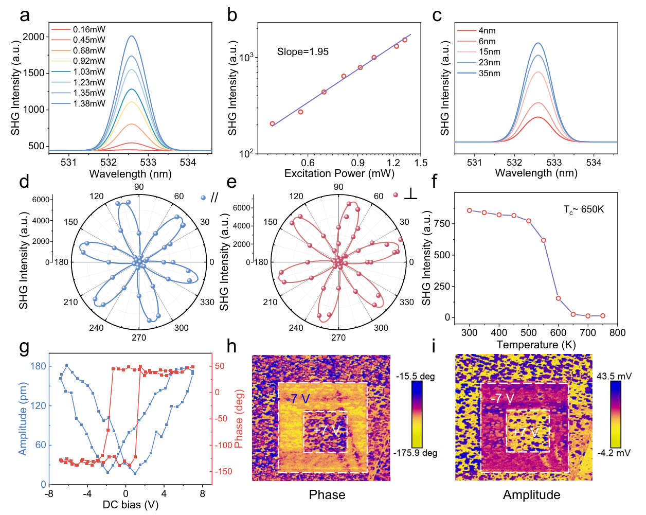 图2. CuVP2S6的二次谐波与铁电特性表征。