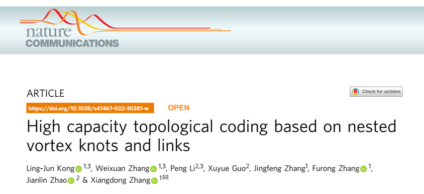 日前,太阳集团城娱8722张向东教授课题组和西北工业大学物理科学与技术学院的赵建林教授课题组合作,在基于嵌套纽结结构高容量拓扑编码研究方面取得重要进展。相关研究成果发表在近期的Nature Communications上,研究工作得到了国家自然科学基金委和国家重点研发计划的资助。