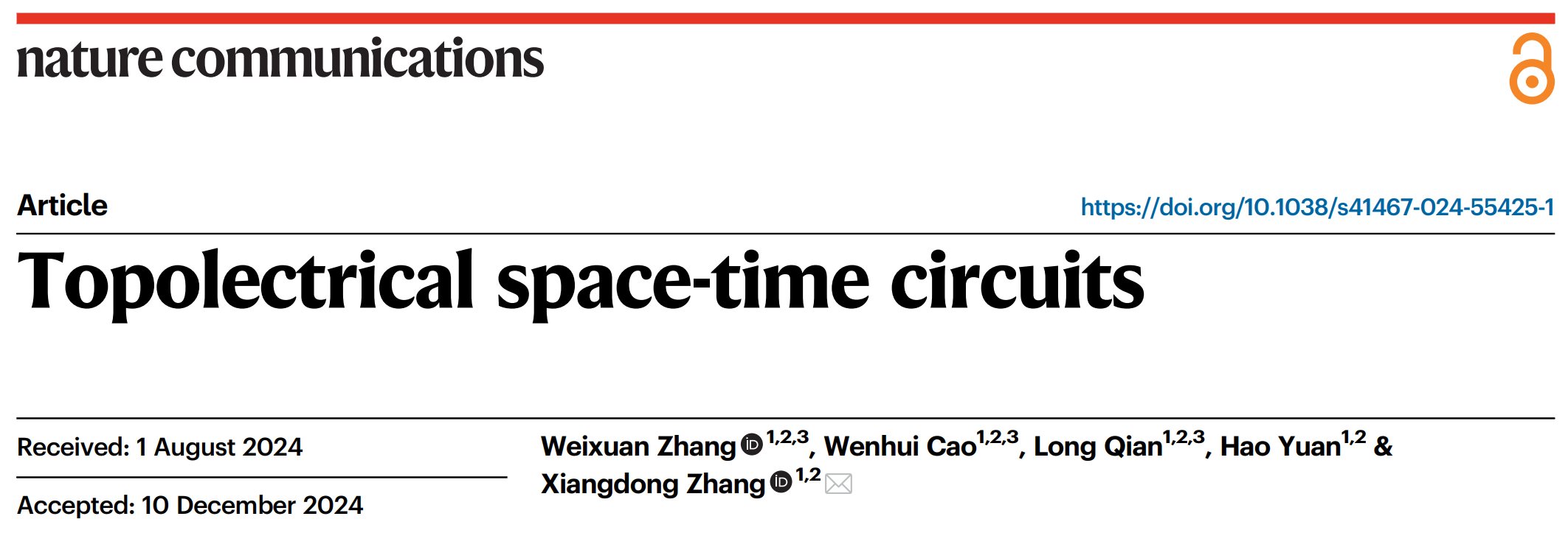 日前,太阳集团城娱8722张向东教授课题组,在拓扑电路研究方面取得重要进展。他们设计并制备出了一种新型空时电路,被称作“拓扑空时电路”,相关工作以“Topolectrical space-time circuits”为题发表在Nature Communications上[Nat. Commun. 16, 198 (2025)]。太阳集团城娱8722张蔚暄研究员和博士生曹汶慧、钱龙为论文的共同第一作者,张向东教授为通讯作者。研究工作得到国家重点研发计划和国家自然科学基金的大力资助。