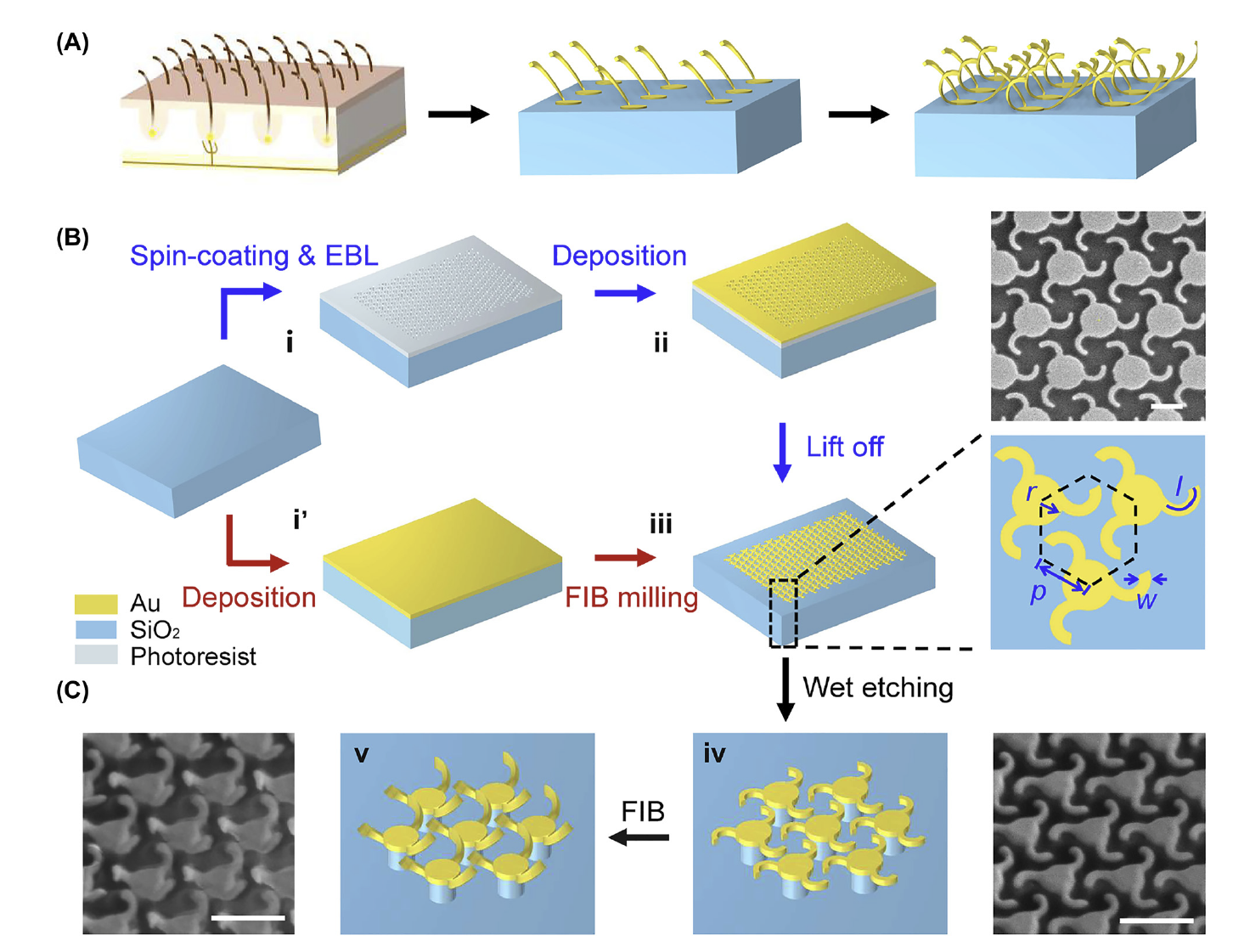 1.三维人工微纳结构制备及功能器件研究1)基于FIB、EBL等工艺的纳米剪纸三维微纳制备技术及光电器件