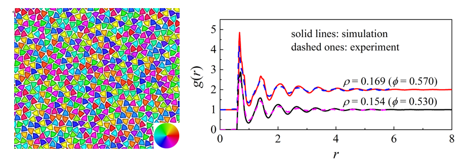 非中心对称粒子体系具有丰富的相行为,研究其固化过程能够为材料设计提供理论指导。我们与实验课题组合作,研究了四边风筝形体系的固化过程,揭示了其融化和玻璃化转变机理。