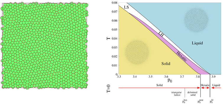 Voronoi模型描述细胞体系(左),二维细胞体系的温度(T)-可变形程度(p0)相图(右)