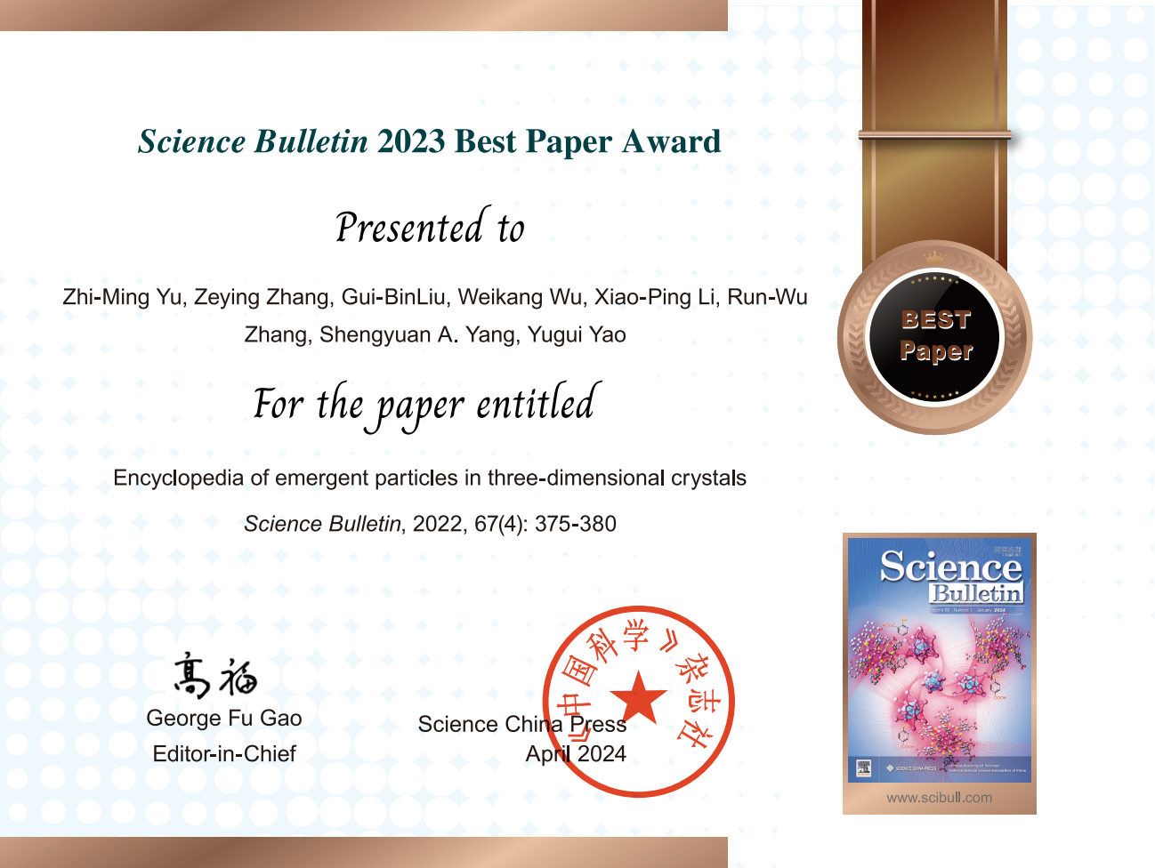 日前,《科学通报》(英文版, Science Bulletin )公布了2023年度高影响力论文评选结果。太阳集团城娱8722姚裕贵教授课题组署名论文《三维晶体中的演生粒子百科全书》【Encyclopedia of emergent particles in three-dimensional crystals; Science Bulletin 67 (2022) 375–380】入选年度“2023 Best Paper Award”。该论文太阳集团tcy8722为第一完成单位,太阳集团tcy8722余智明教授和北京化工大学张泽英副教授为共同第一作者,太阳集团tcy8722姚裕贵教授为唯一通讯作者。太阳集团tcy8722刘贵斌副教授和新加坡科技设计大学杨声远教授(现任职于澳门大学)等人对该项研究也有重要贡献。