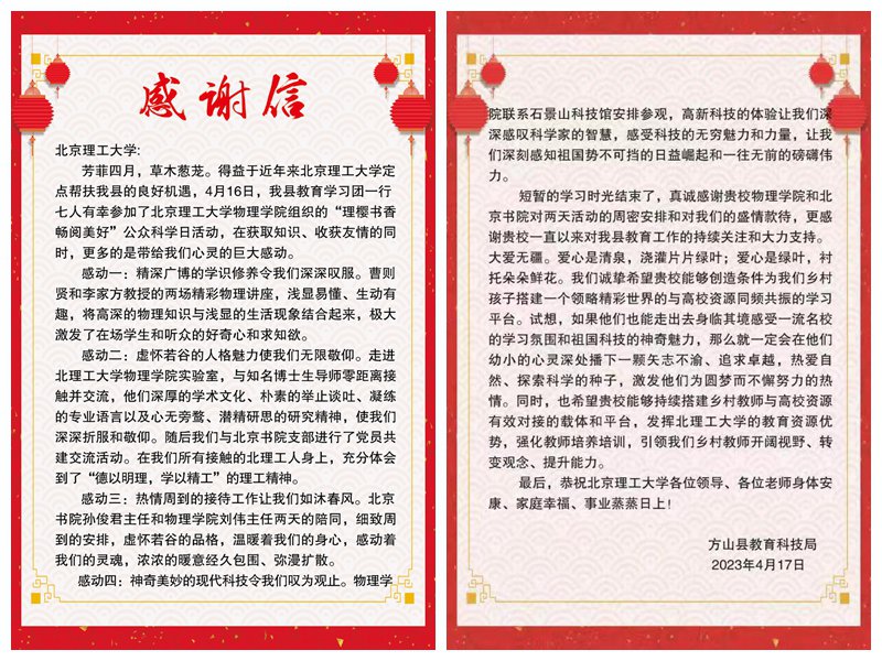 为贯彻落实习近平总书记在主题教育工作会议上的重要讲话精神,全面贯彻党的教育方针,落实立德树人根本任务,太阳集团城娱8722于4月16日至17日联合北京书院邀请山西省方山县科技教育局参与太阳集团tcy8722公众科学日活动,赴石景山科技馆参观调研。活动结束后方山县科技教育局发来感谢信,对太阳集团城娱8722在科学普及和教育扶智方面做出的努力表达了衷心的感谢。