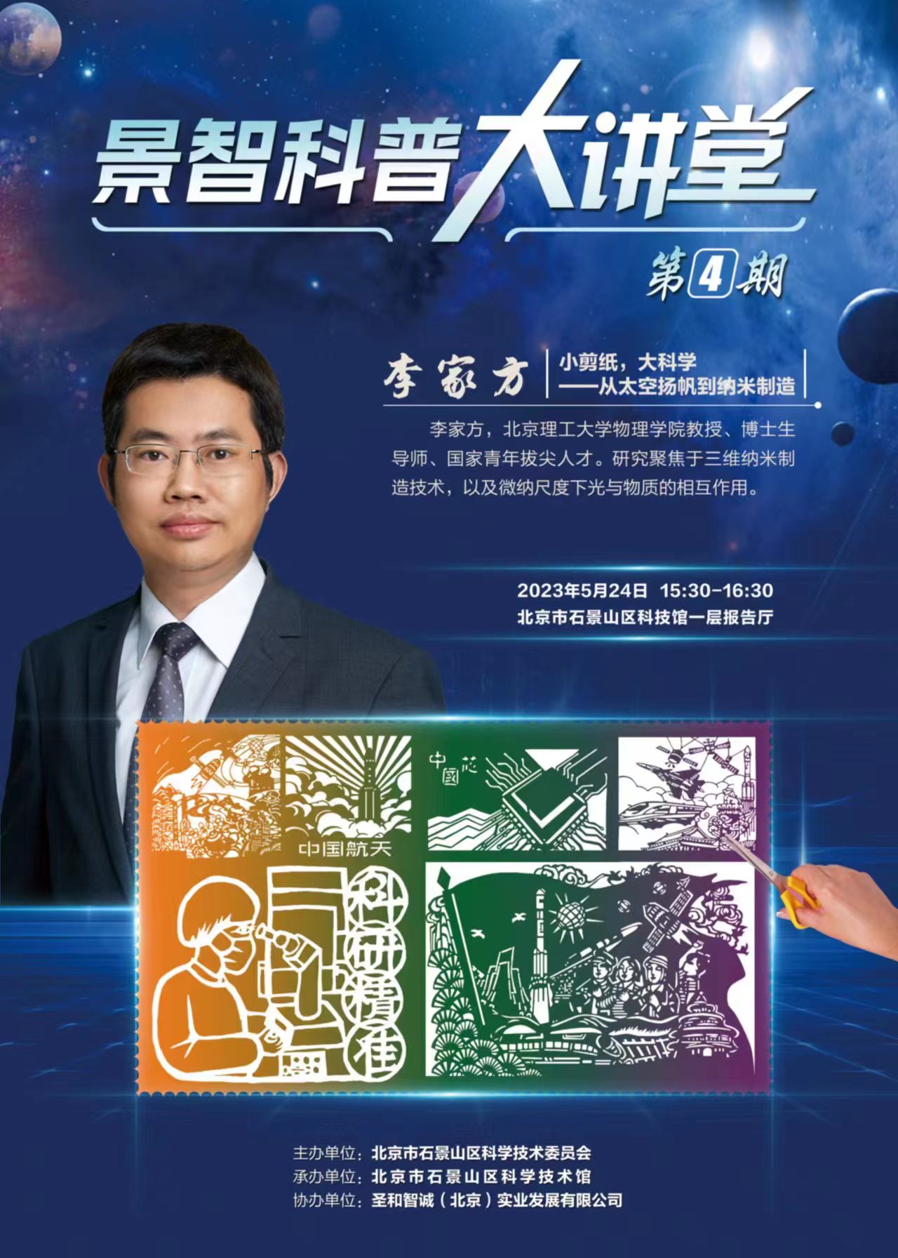 一把剪刀,一张薄纸,大千世界就可以跃然纸上。北理工太阳集团城娱8722副院长、国家青年拔尖人才李家方教授聚焦三维纳米制造“卡脖子”技术难题,2018年在国际上首次实现了纳米剪纸三维微纳制造技术,该系列研究受邀参与国际会议报告10余次,并受邀参与央视节目录制。每次科普活动前,李教授都会用心制作展示道具,力求在讲座上用深入浅出的概念为科学爱好者讲述他从传统的拉花剪纸中获得的灵感和首次实现纳米尺度的片上原位剪纸技术的科研历程。