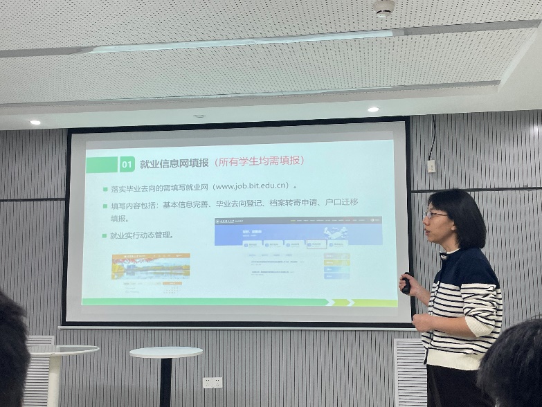 任志宏老师详细介绍了三方协议办理、就业信息网填报、户档转寄等手续办理流程,并对就业政策进行深入的剖析,现场解答同学们的疑问,力求让每一位同学都能透彻掌握就业政策的相关内容。同时,依托翔实的就业数据,深入分析本专业的就业情况,使同学们对本专业的就业前景有了直观且全面的认知,进一步明确求职方向。
