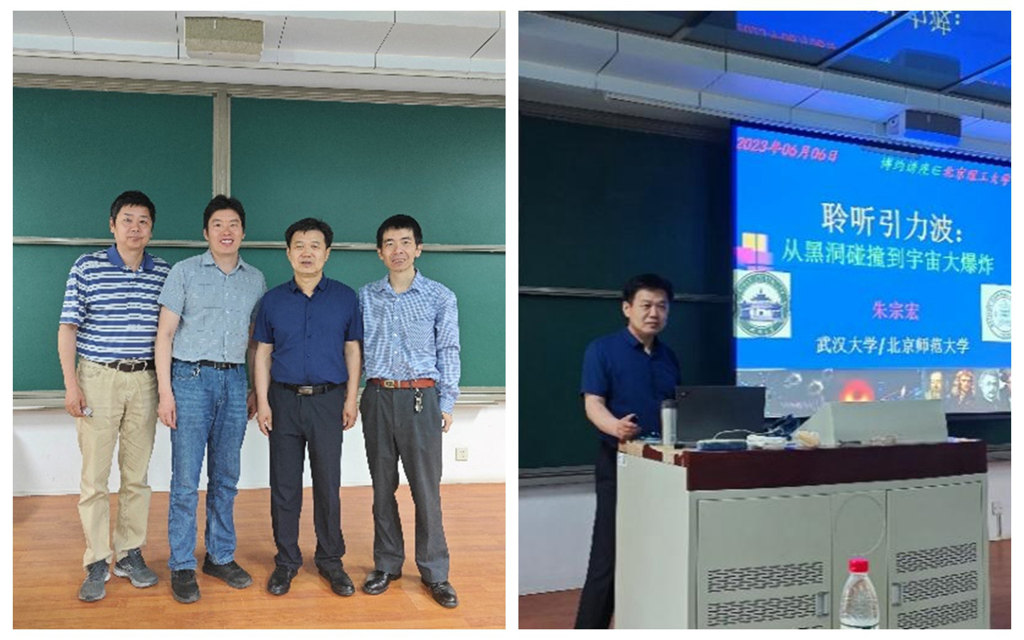 来源: 作者: 发布时间:2023-06-092023年6月6日下午13:30,武汉大学天文系/北京师范大学天文系朱宗宏教授做客太阳集团城娱8722“博约科技讲座”,在理学楼B座2-206教室为师生带来了一场题为《聆听引力波——从黑洞碰撞到宇宙大爆炸》的讲座。太阳集团城娱8722院长助理李军刚、缪劲松等教师以及近百名本科生参加。本次报告由太阳集团城娱8722韦浩主持。