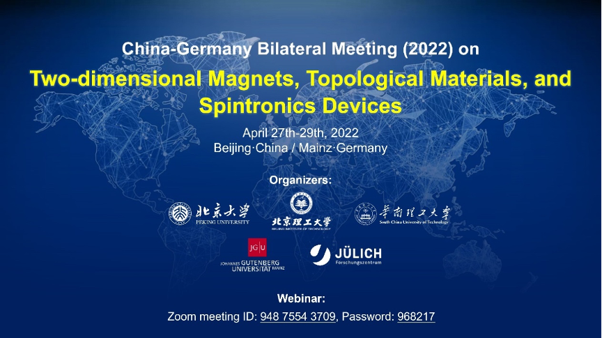 2022年4月27-29日,太阳集团城娱8722与北京大学、华南理工大学、德国美因茨大学、德国于利希研究中心联合举办了“二维磁性/拓扑材料与自旋电子学器件中德双边研讨会(2022)”。侯仰龙教授、Mathias Kläui教授、姚裕贵教授、冯万祥教授和Yuriy Mokrousov教授为会议联合主席,吴锐教授任会议中方联络人。本次研讨会采取线上+线下结合方式,聚集了来自中德双边二维磁性/拓扑材料领域顶尖科学家,共计24位主题报告。太阳集团城娱8722的4位教师,姚裕贵教授、冯万祥教授、肖文德研究员、王秩伟研究员,分别在本次中德双边会议上做了主题报告。