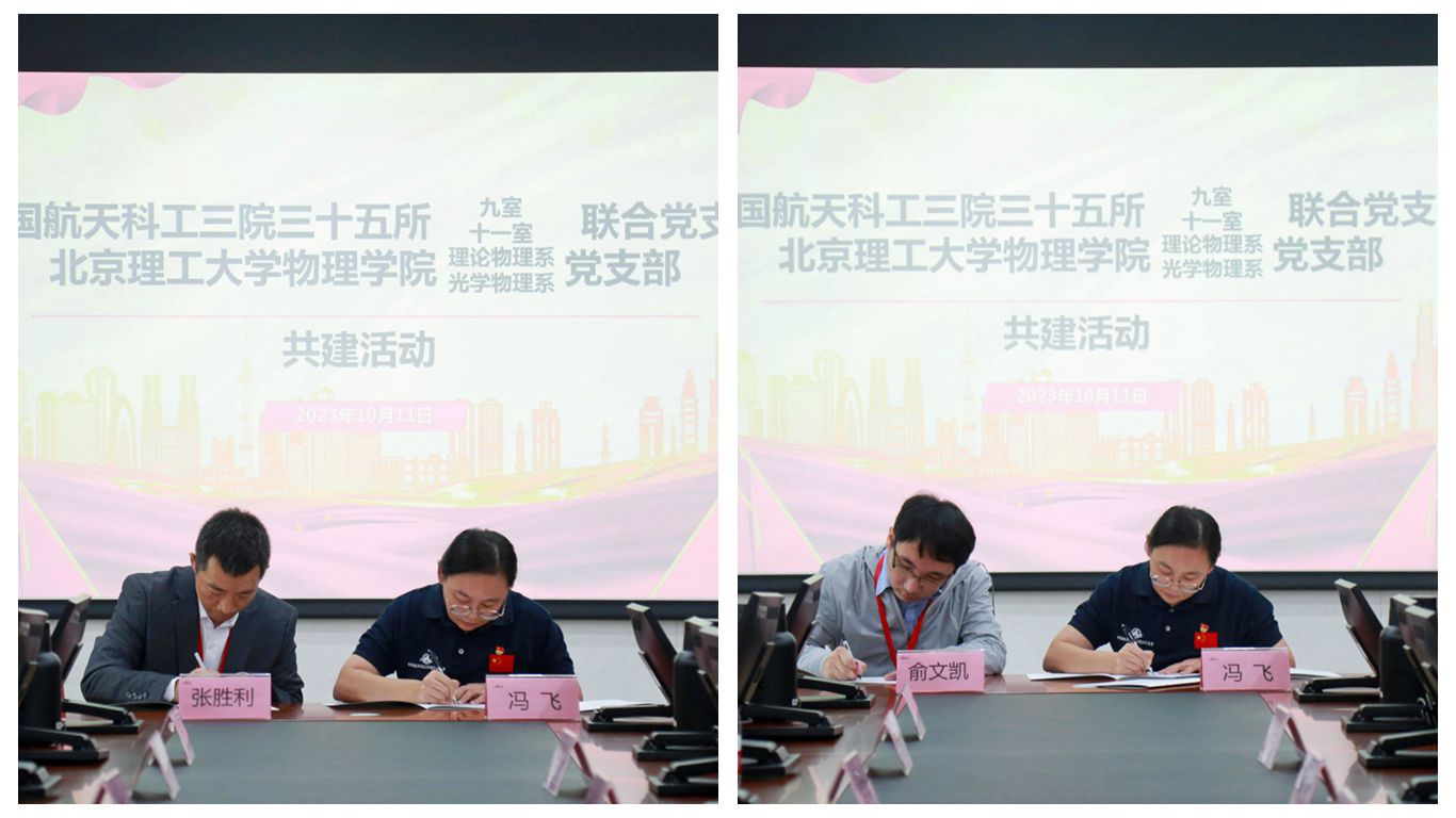 党建工作交流结束后,张胜利、俞文凯分别代表太阳集团城娱8722理论物理系党支部和太阳集团城娱8722光学物理系党支部与三十五所九室十一室联合党支部签署共建协议,并由冯飞代表双方宣读共建协议具体内容。
